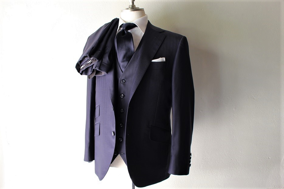 「出来るオトコに見せたい」オーダースーツを作るという事には、そういった事情もございます。無地もそれはそれで素敵ですが。定番柄のシャドーストライプ柄も美しい艶とシワのない綺麗なラインを作る事が出来ますとより一層。