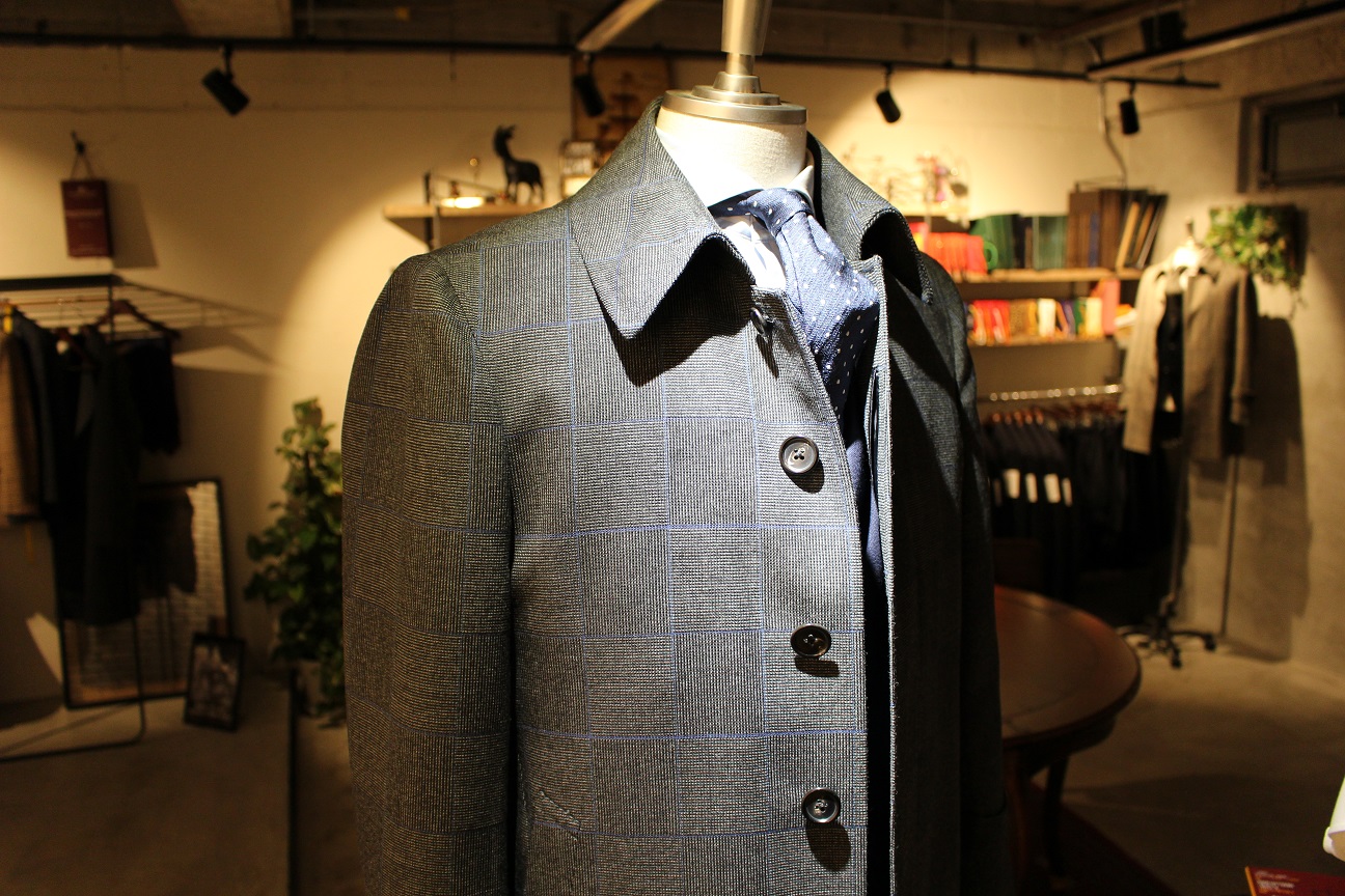 本日のご紹介はステンカラーコート。コート生地に相応しいガッシリとした織。打ち込みがしっかりとしている割に、肉厚はそこまでございません。ゴワゴワする事なく着こなして頂ける為、スタイリッシュな印象に。主張は強過ぎず、面白いブロックチェック柄となっております。S様、いつもありがとうございます。ハイセンスなコートに仕上がりましたヨ。