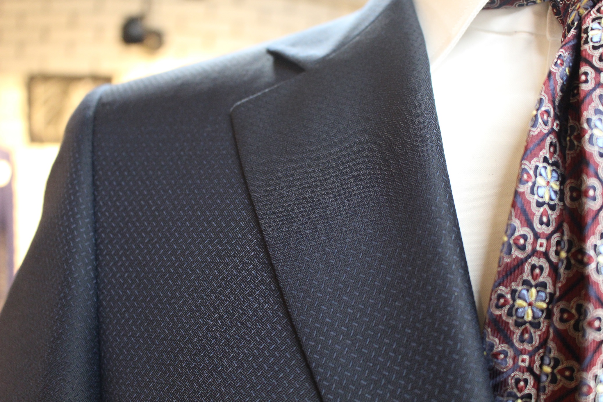 ビジネスシーンはもちろん、フォーマルな場での一着にもお勧めしたい柄行き。ご紹介のスーツはオールシーズン用の服地ですが、春夏シーズンの服地にも織柄のコレクションは多く含まれております。仕事上、無地系のスーツしか着用出来ない方にもお勧めですネ。