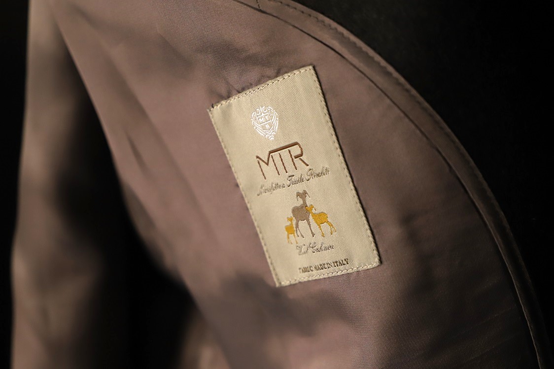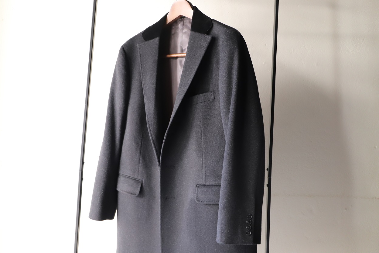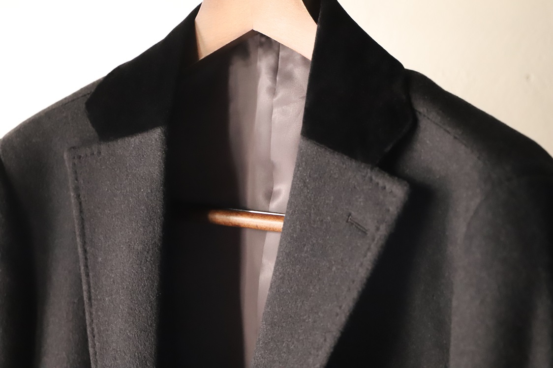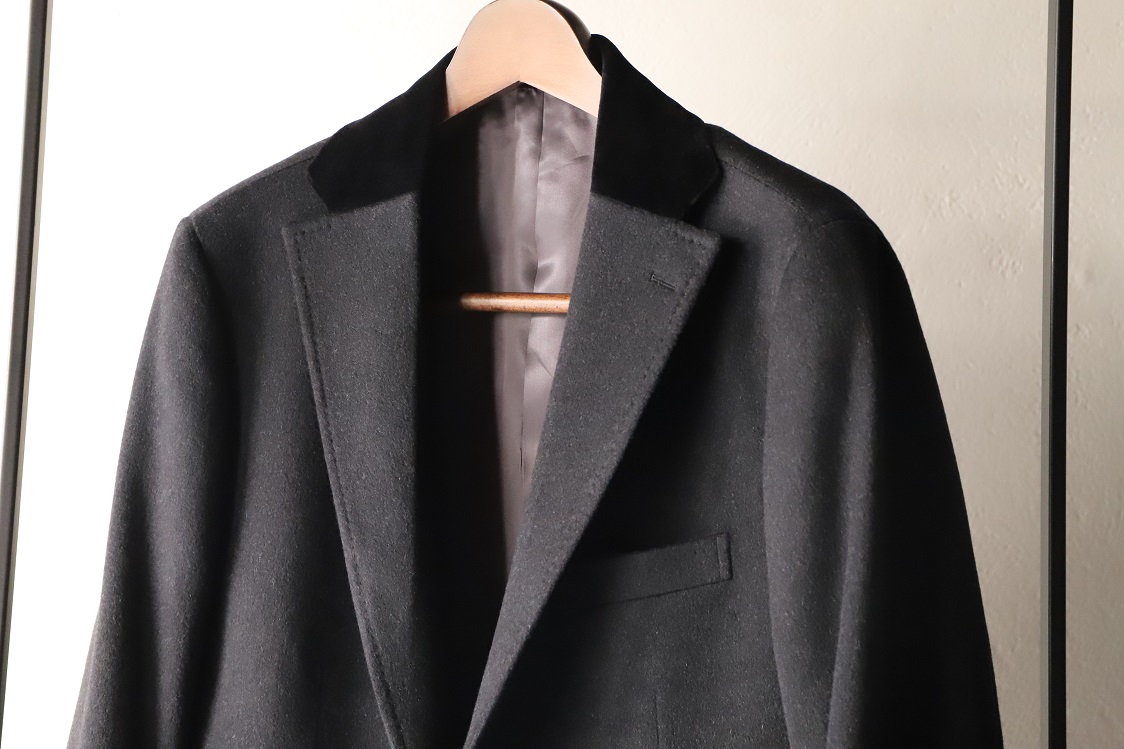 MTR(マニファットゥーラ・テッシーレ・リサリーティ)。ウール&カシミヤのチャコールグレー生地。上衿切り替えでコットンベロアを採用。クラシカルな雰囲気が増しましですネ。