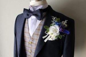 同トーンのシャツ、蝶ネクタイ、チーフを揃え、ホワイトのジャケットを合わせるとドレッシーな印象に仕上がります。デニムパンツが程よいヌケ感を演出。
