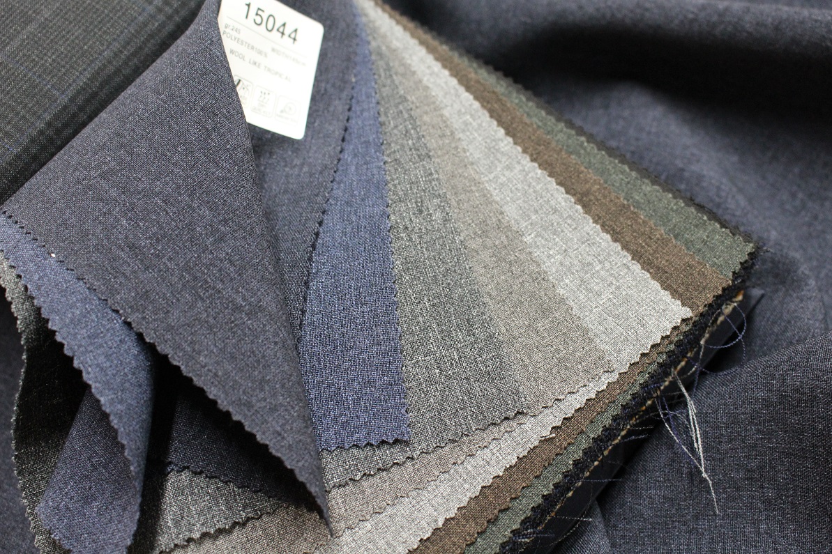ウールにしか見えない、ポリエステル100%の服地。ウールのしなやかさを損なわず、抜群のストレッチ機能と、防皺性を兼ね備えております。暑い夏、水洗いが出来るのも嬉しいトコロ(パンツのみ)。