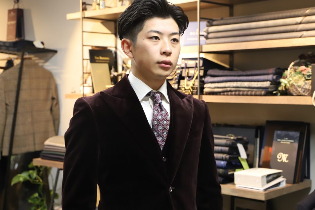 本日は、成人式用にてオーダーいただいたベルベット生地のスリーピースをご紹介。色気が感じられるベルベット生地をブリティッシュスタイルにて仕上げました。まさに成人式にはピッタリのスタイルかと。H様、この度は誠にありがとうございました。