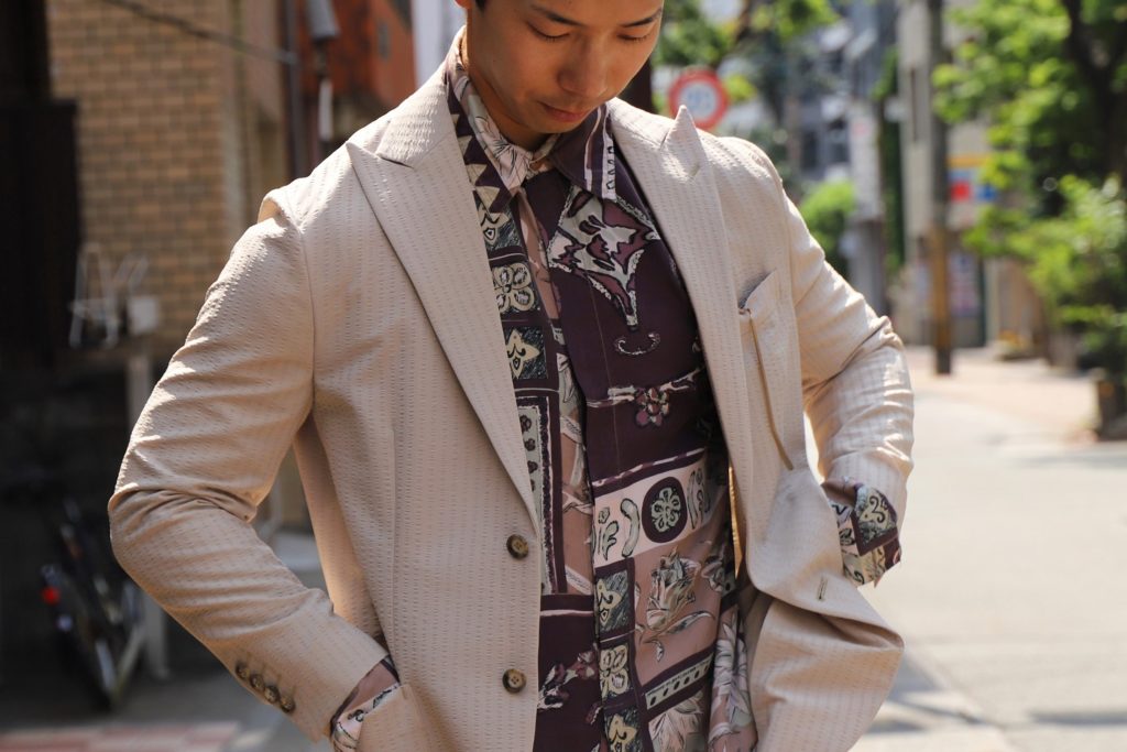 本日のご紹介は、ベージュカラー、シアサッカーのセットアップ。今回はワイドパンツにて。風通しも抜群でベタつかない。夏の普段着はこれで決まり?