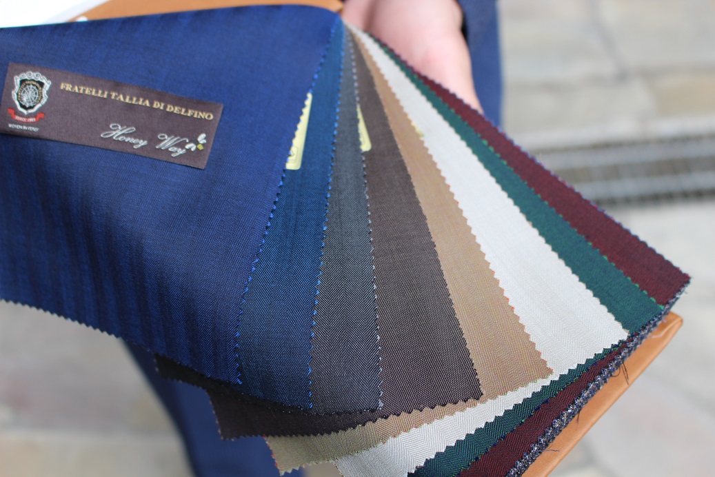 本日はタリアディデルフィノ社より、ソラーロのスーツをご紹介。玉虫色と呼ばれるこの服地。光の当たる角度によって表情を変える。