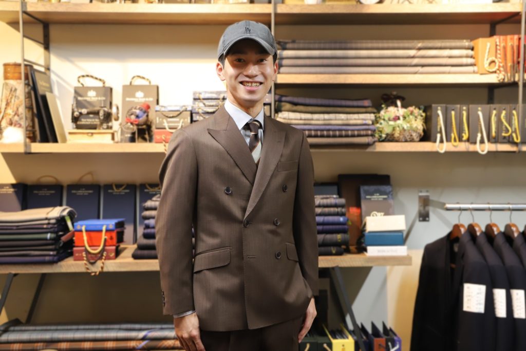 今回はブラウンのソラーロ生地をセレクト。ダブルブレストのデザインにて。とてもお似合い。バッチリでしたネ。