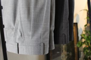 室内では無地、光が当たるとチェック柄が出現。ブルーのラインなので、あまり目立たず、ビジネスでも問題なく取り入れられます。チャコールグレーでありながら、清涼感もあるのはそのお陰。。。Super100’sの服地でも、アンダー5万円でオーダー出来ます。