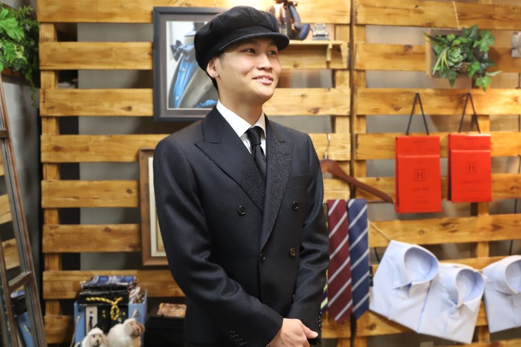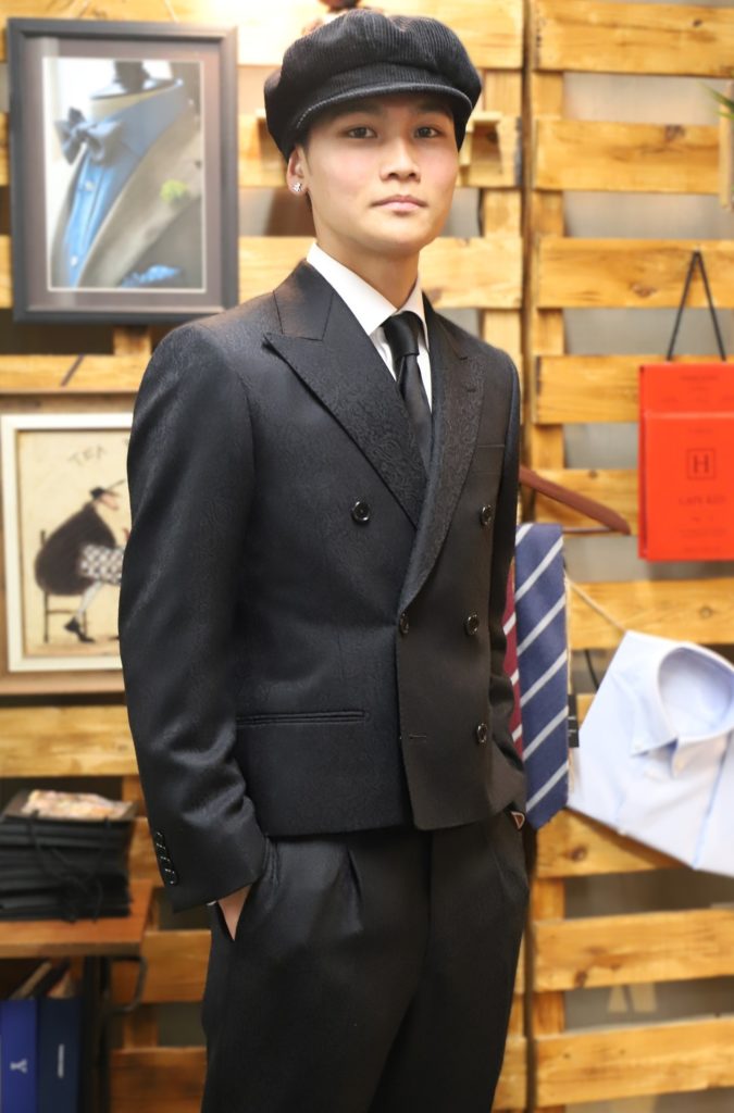 本日は成人式用にオーダーいただいておりました、ショート丈ジャケットのセットアップをご紹介。イタリアブランド「クアレーニャ」の、ブラックジャガード生地をセレクト。