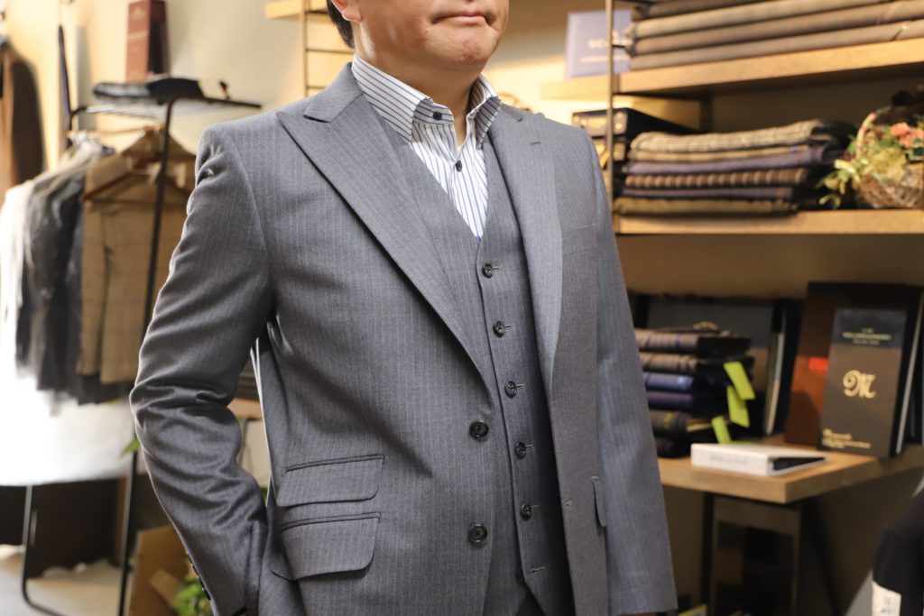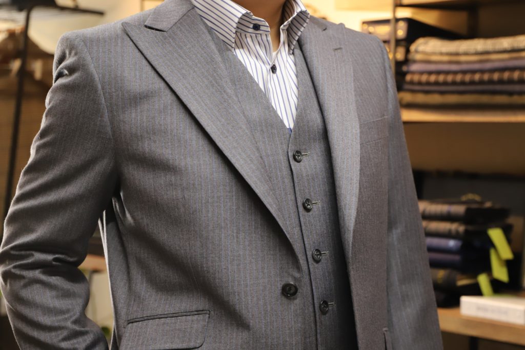 本日は秋冬のビジネス用にてオーダーいただいておりました一着をご紹介。ライトグレーのスリーピース。敢えて秋冬に明るめの色を着こなす。まさに洒落者のなせる業。若干の起毛感が良い感じで、バランスを取ってくれていますネ。