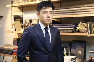 ブリティッシュスタイルがお好きなK様、ジャケットはピークドラペルに適度なビルドアップショルダーで、ベストは6ボタンをチョイス。まさにイタリアと英国のミックスデザイン。今まさに人気のスタイルかと。