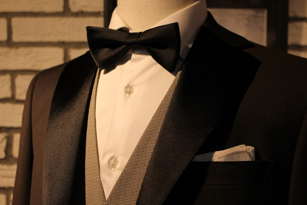 ブラウン系のタキシードにベージュ千鳥のベストを合わせました。クラシカルでありながら、今風のナチュラルなムードも感じられるコーデ。最近はフォーマルな場面においても、ブラウンや、カーキといったアースカラーに注目が集まっております。