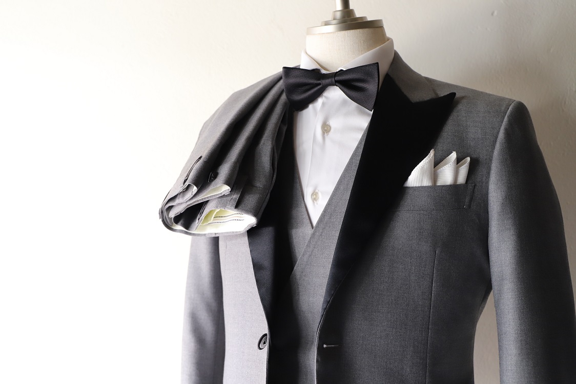 ライトグレーのタキシード。ブラックラペルとのメリハリがしっかりとあり、特別感が増しておりますネ。ブラックやネイビーとはまた違った良さがございます。お写真では伝わりづらいですが、ダブルデザインのベストも拘っていただきました。