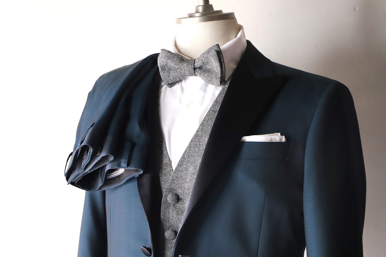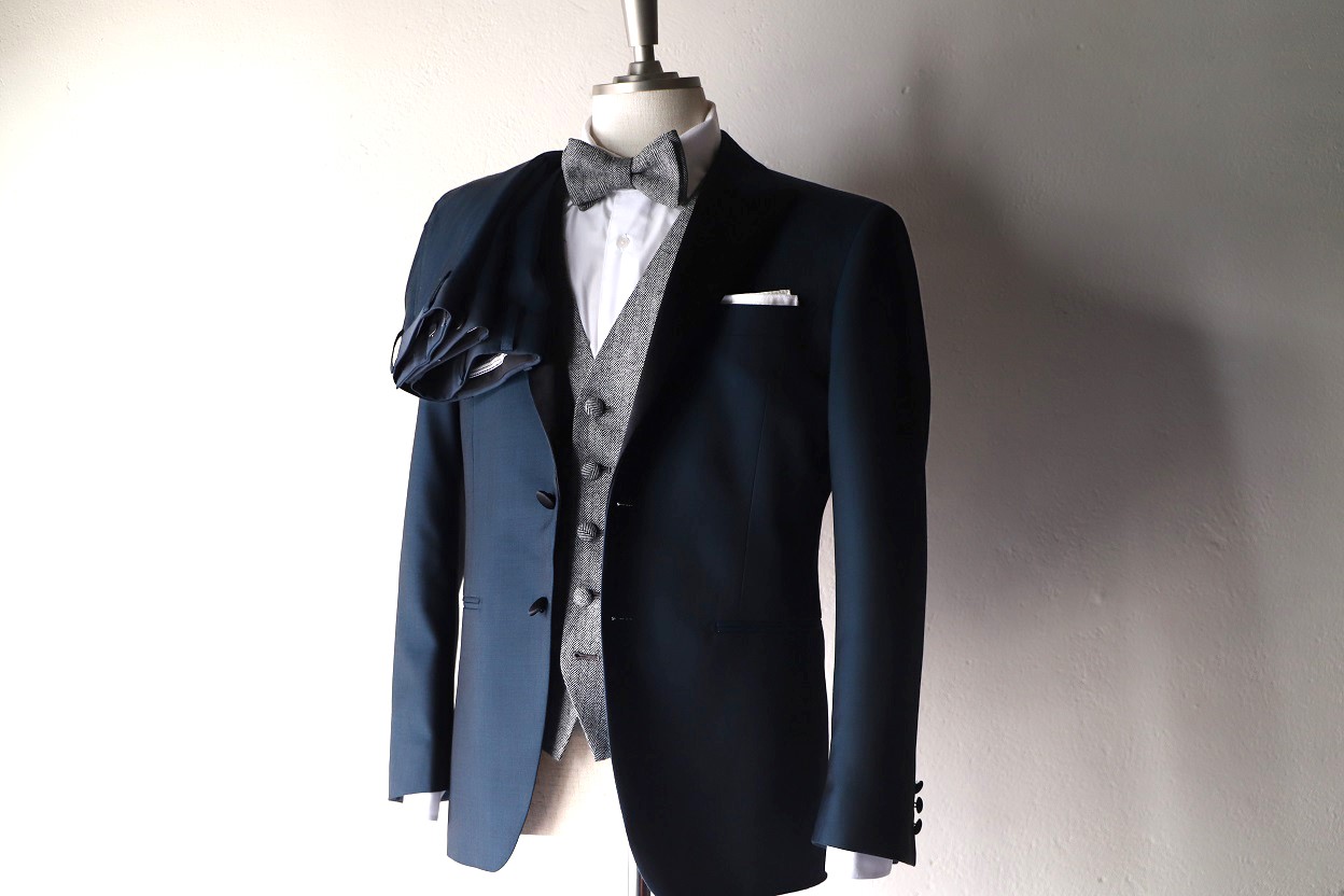 今回はタキシードに加え、ベスト&タイもオーダーいただきました。ツイード素材で、オシャレ可愛い雰囲気に。これは上着を脱いでも様になるってもんです。
