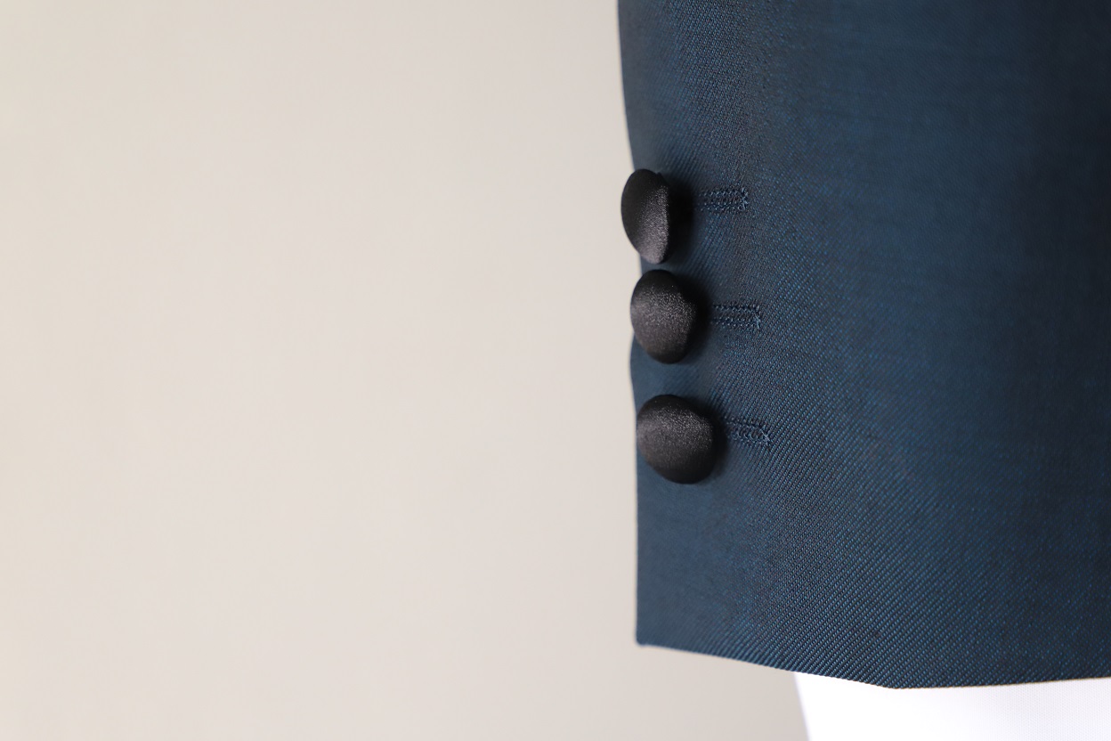 本日のご紹介は、ターコイズブルーなタキシード。最近、このお色が流行ってきておりまして、生地メーカーなども注目しているそうな。定番のネイビーとは一味違った、華やかさがございますヨ。