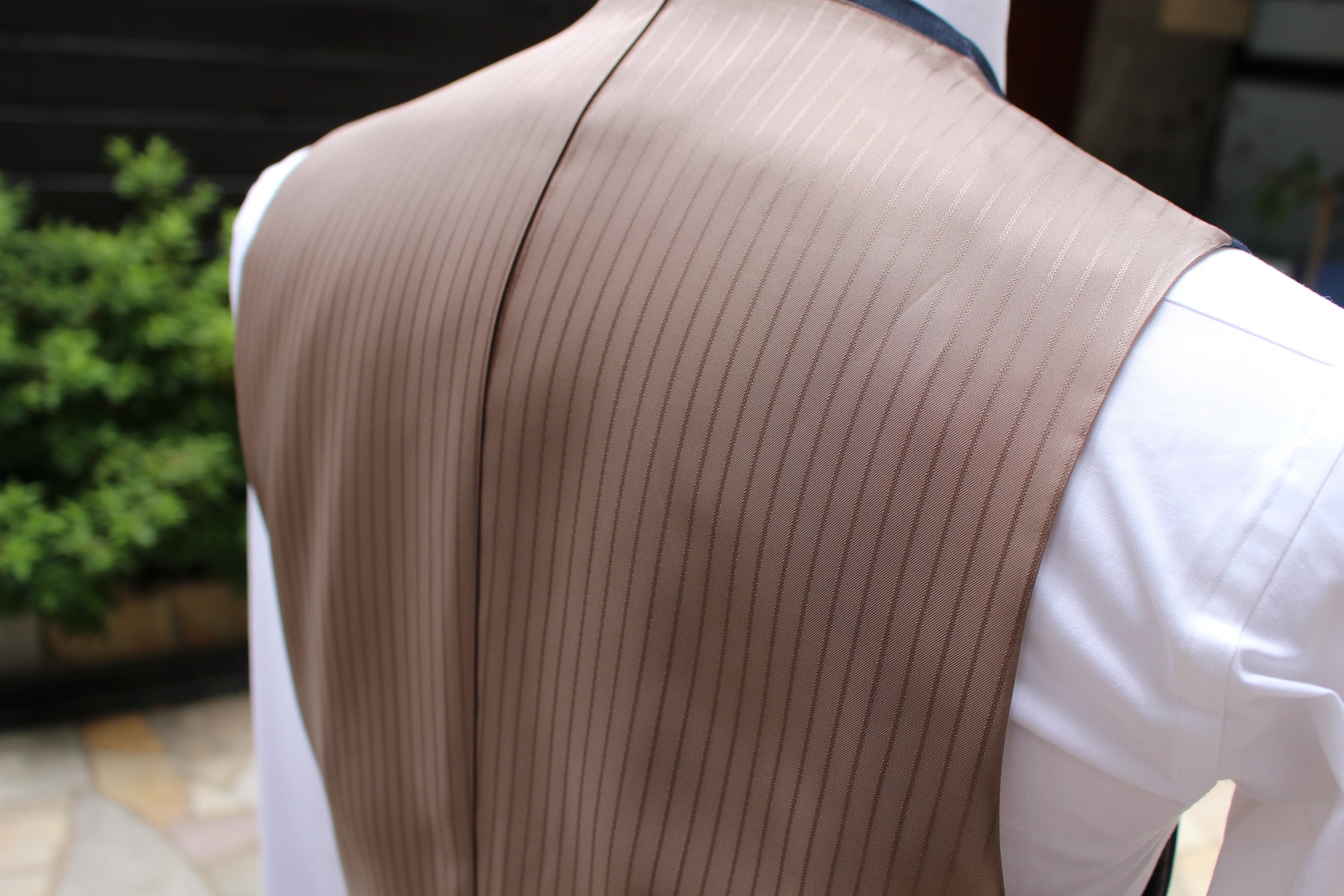 さらに上品な仕上がりに。。。ベストもオーダーされた場合、背中にも裏地をお付けします。上衣を脱いだ時に見える裏地は重要ですヨ。