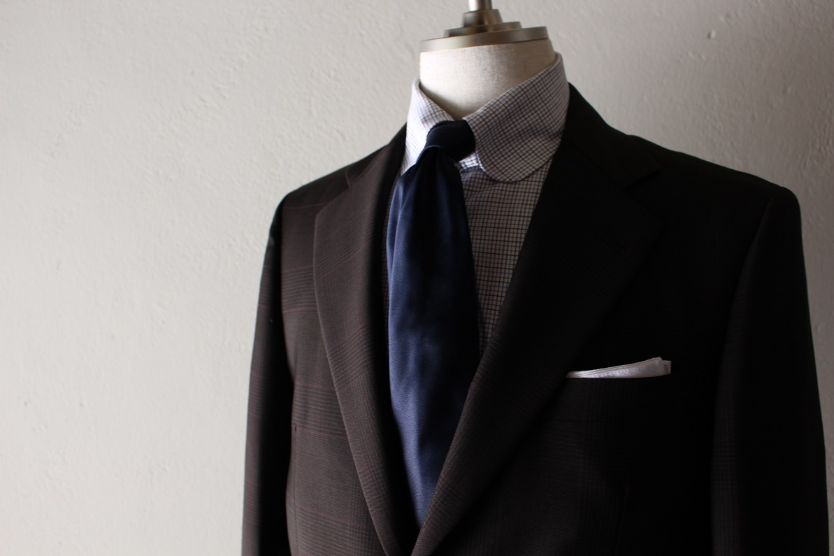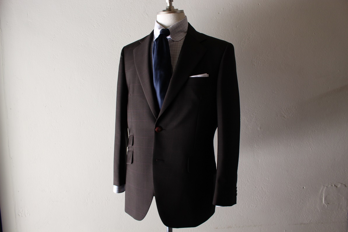 さり気ないグレンチェック柄にオーバーペンの柄行き。パープル系の糸色が乗っても奇抜な印象もなく、いい意味で、クラシカルな雰囲気を崩しておりませんネ。モヘヤクアトロ。モヘヤのハリコシが前面に出ており、パリッとしたスーツに仕上がります。服地に、ヌメリや柔らかさをお求めの方にはNGですネ。どちらかというと英国的な印象です。べたつきを抑えてくれるので、これからの時期の着用もお勧めですヨ。