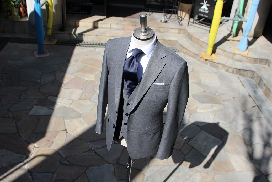 シルク混紡、ミディアムグレースーツ。ウール100%の服地とはひと味違う光沢感。太陽光により美しさが倍増。美しさもさることながら、丈夫さも増すのがシルクの良いトコロ。