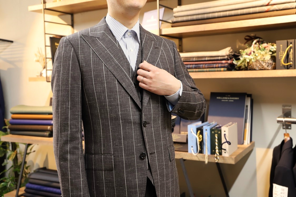 本日は素敵なブラウン系スリーピースのご紹介を。リネン混紡で季節感がございまして、ブラウンカラーでも重さを感じず、爽やかな印象に仕上がりましたヨ。