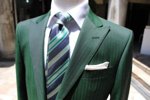 結婚式用にてオーダーいただきました、ウール&シルクのシルバーのスーツ。華やかなスーツも、組み合わせ次第で二次会スタイルに変身出来ます。