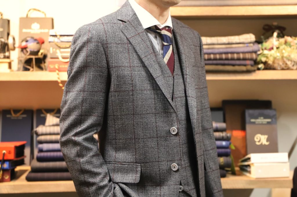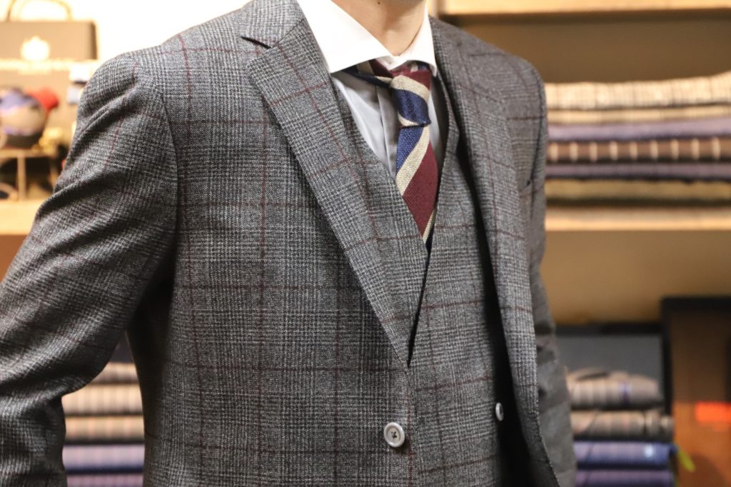 本日は素敵なソフトフランネル、スリーピースのご紹介を。I様、いつもありがとうございます。「赤いウィンドウペンが良いねぇ」との事でオーダー。気に入っていただき、大変うれしく思います。