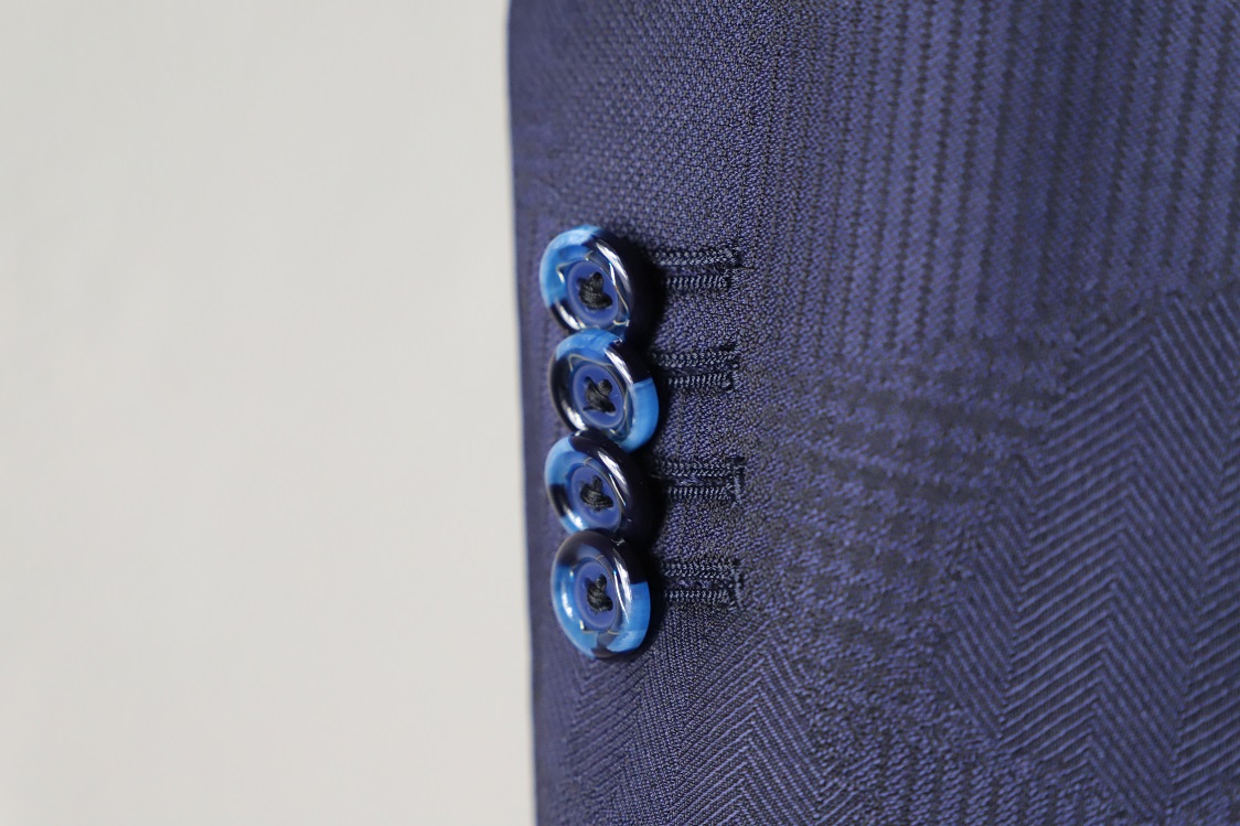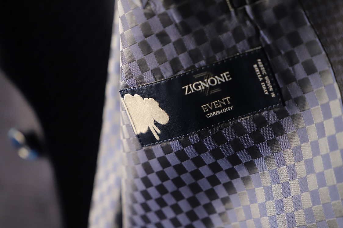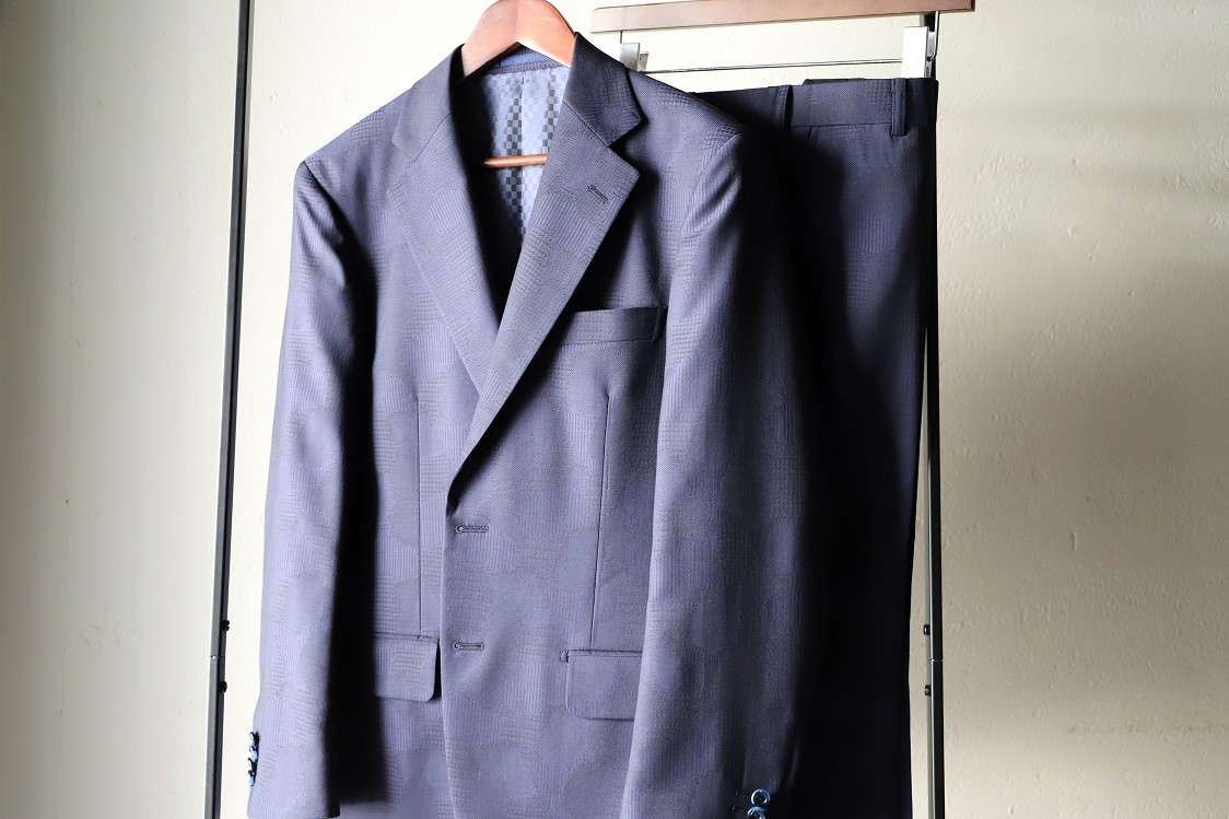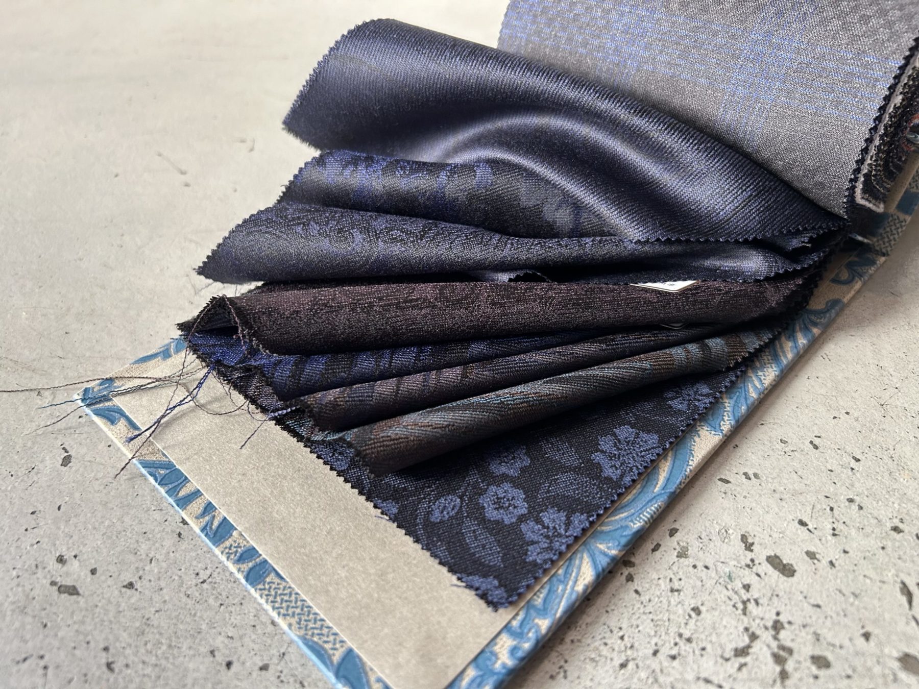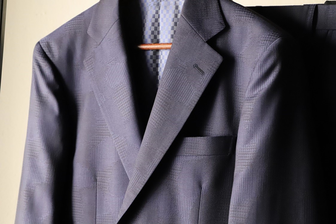 本日のご紹介は、ジニョーネ社のパーティーコレクション。イタリアブランドらしく、華やかな柄行きを得意としている。一見、ネイビー無地のシンプルなスーツに見えますが、、