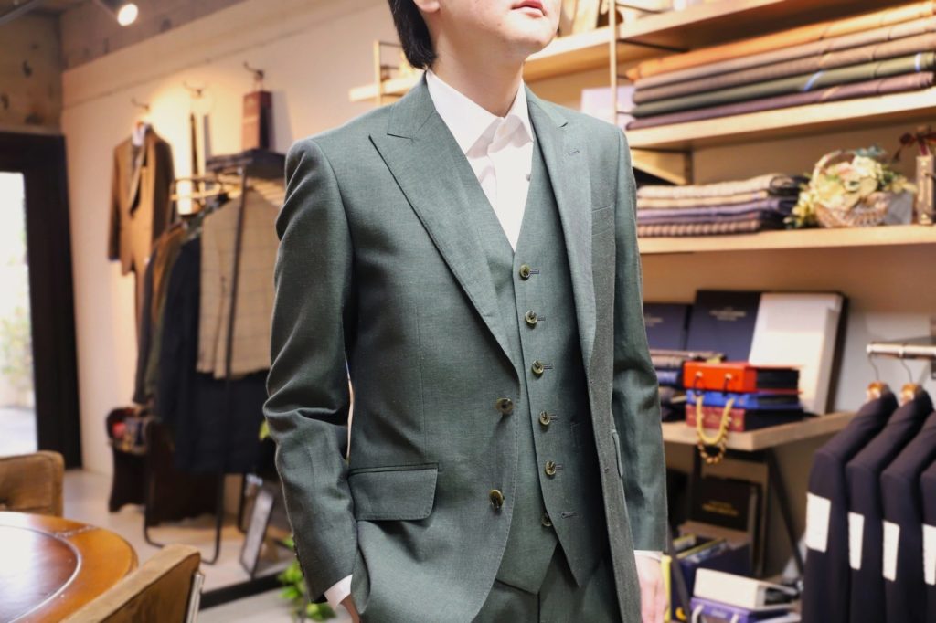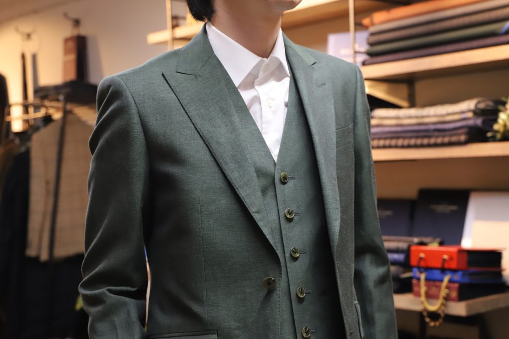 本日は、4月の挙式に向けてオーダーいただいておりました素敵な新郎様衣装のご紹介を。リネンの風合いが感じられる、爽やかなグリーンカラーのスリーピーススタイル。N様、この度は誠にありがとうございました。