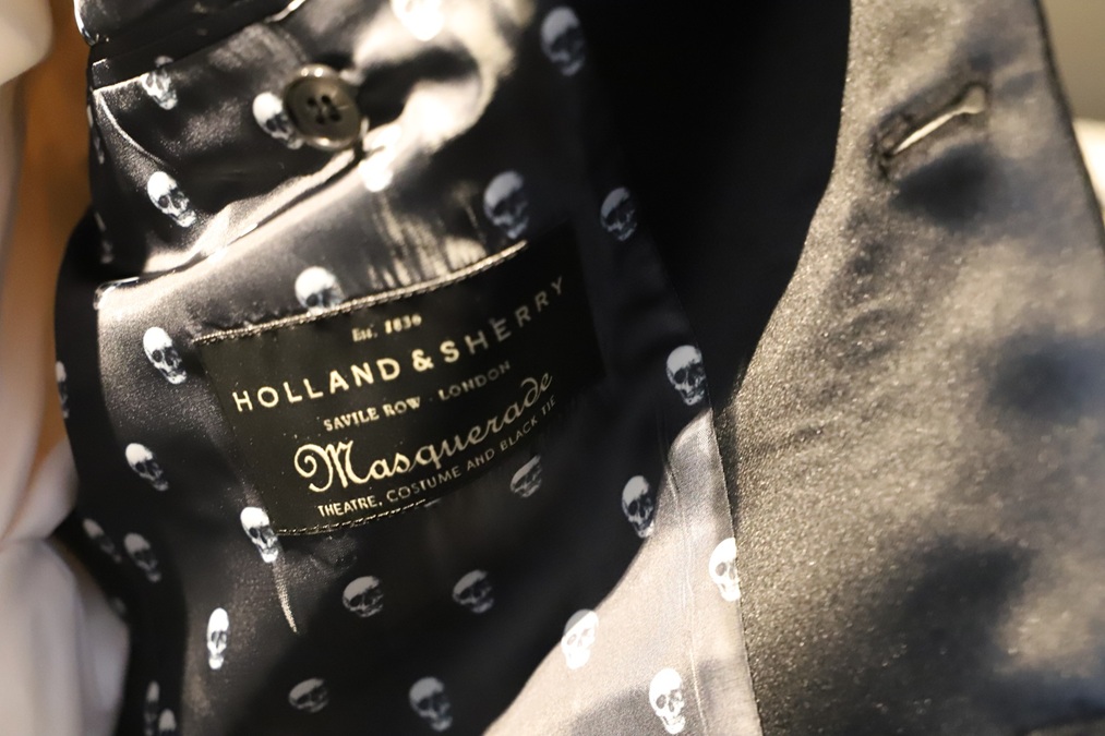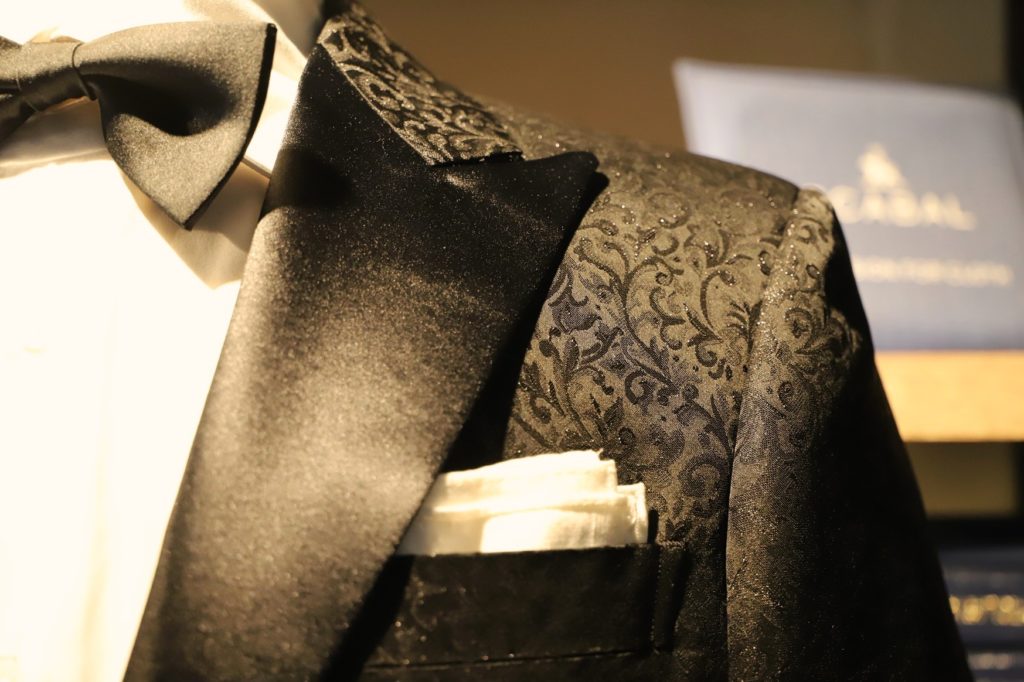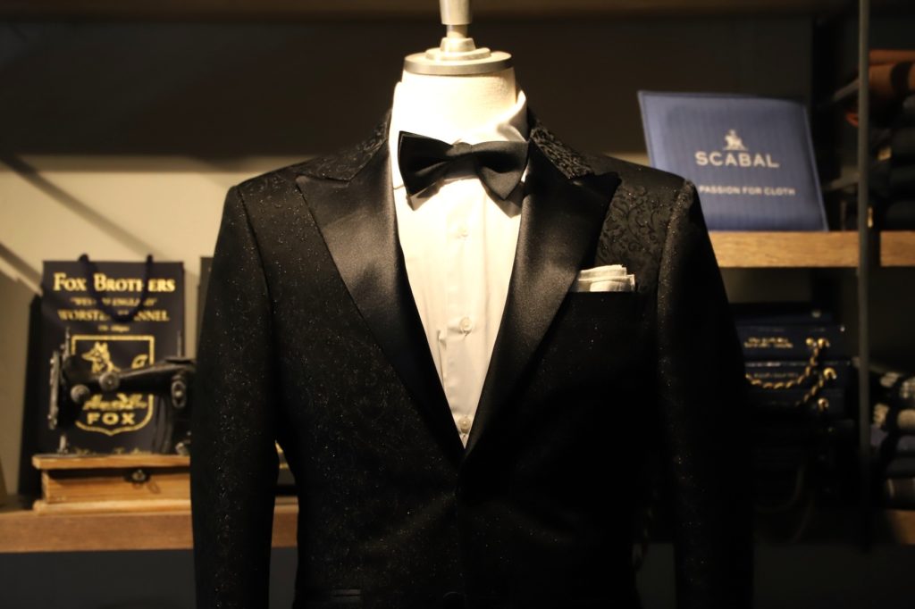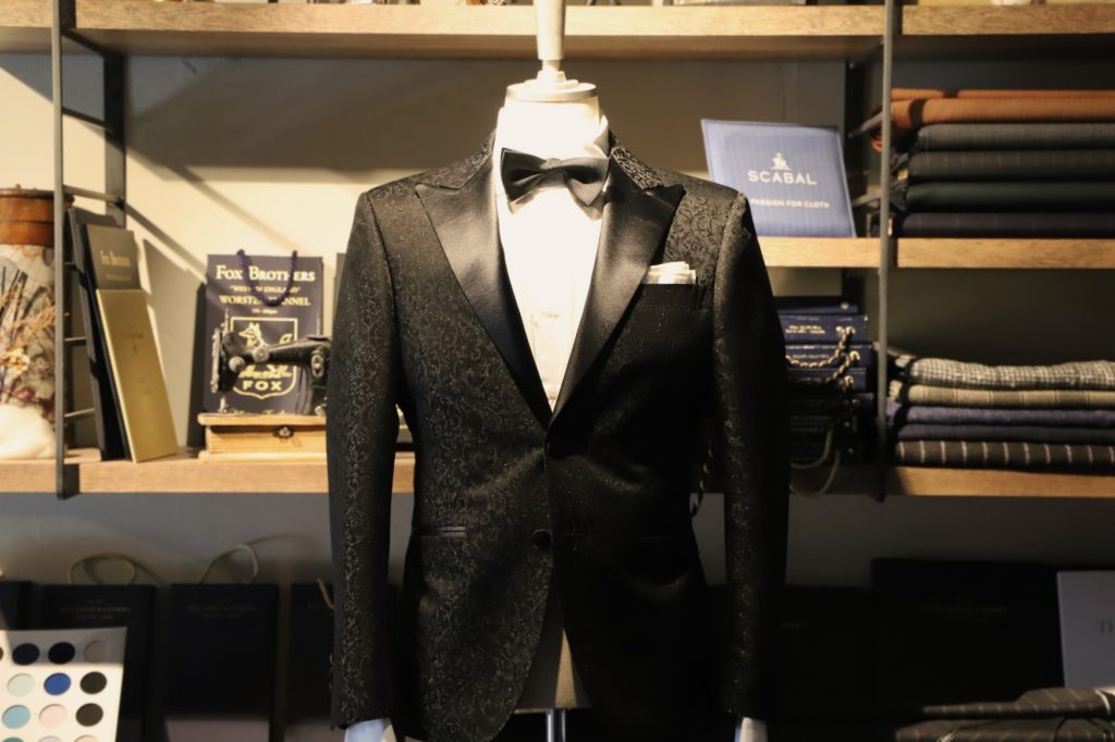 ラグジュアリーブランド・ホーランドシェリーのパーティーコレクション「マスカレード」。華やかな服地が詰まっている同コレクションですが、今回はラメが織り込まれた、ブラックジャガードをセレクトいただきました。こんなにも贅沢なタキシードは中々お目にかかれませんヨ。