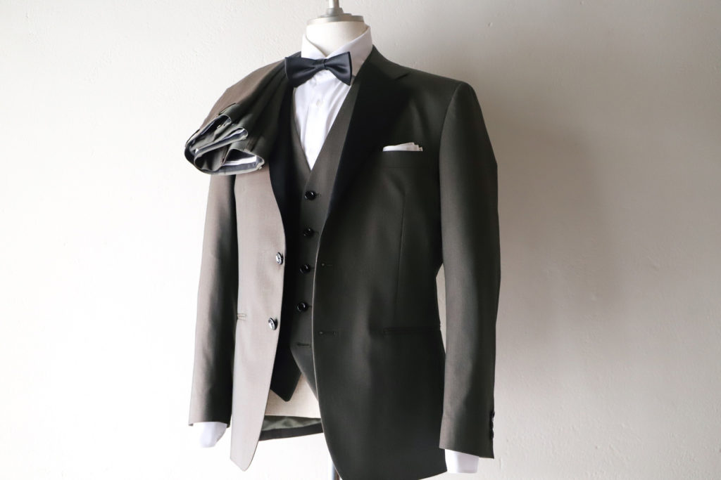人気のカーキカラータキシード。茶と緑の絶妙なバランス。フォーマルでエレガントな式場から、カジュアルなレストランウェディングまで、全てのシーンにおいて、上手く馴染んでくれますヨ。写真映えも間違いなし。