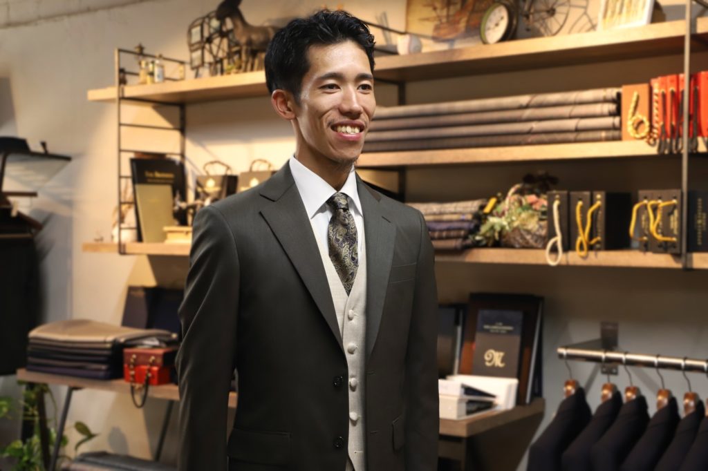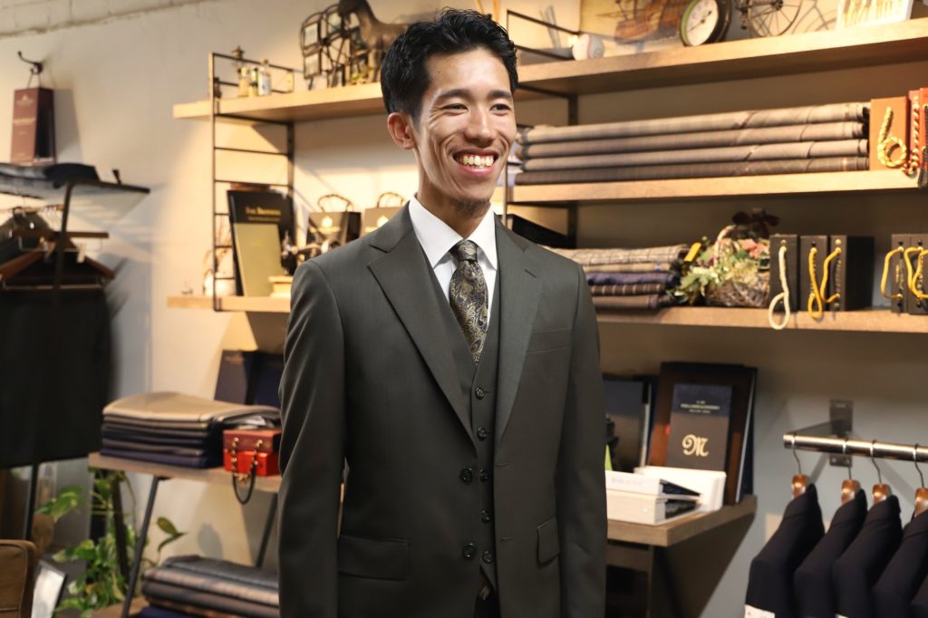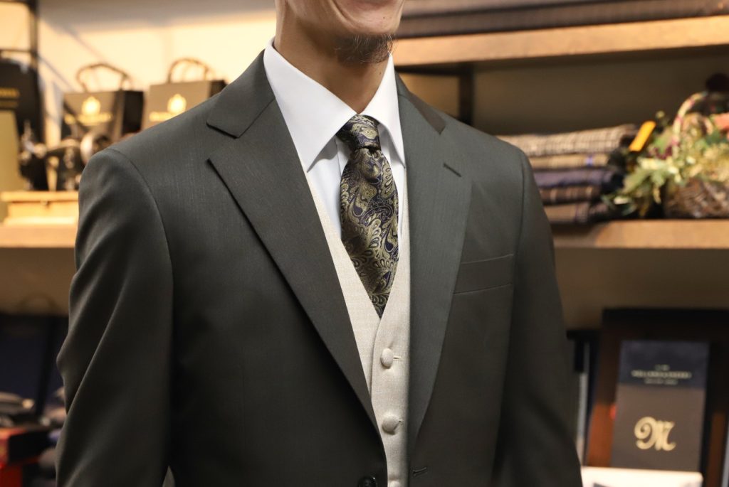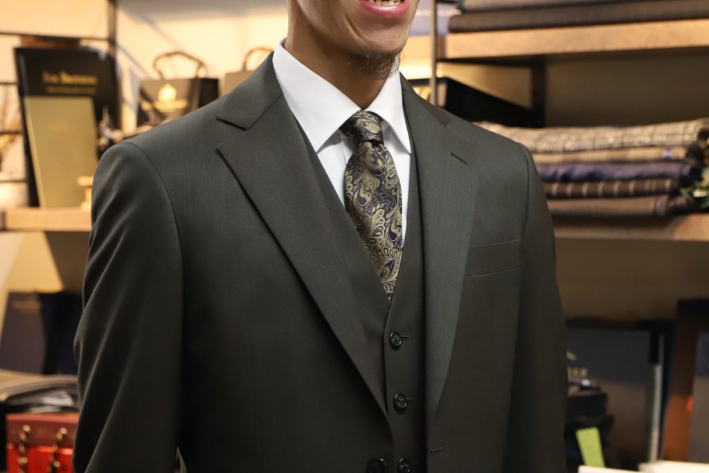 カーキカラーのスリーピースに、ホワイトシャツ、ビンテージ風タイのオーダーをいただきました。特殊カラーではありますが奇抜さは無く、ハイセンスで、大人お洒落な印象に。